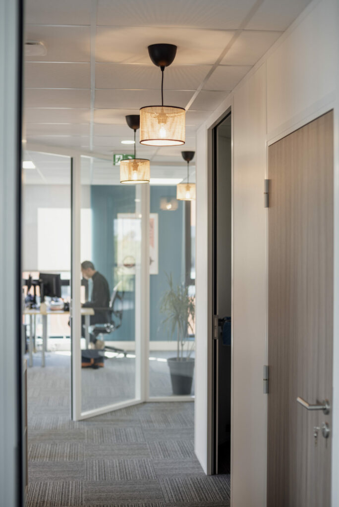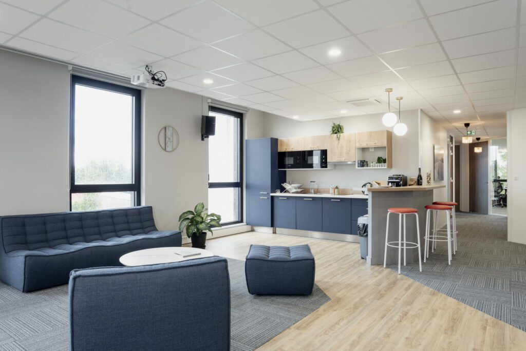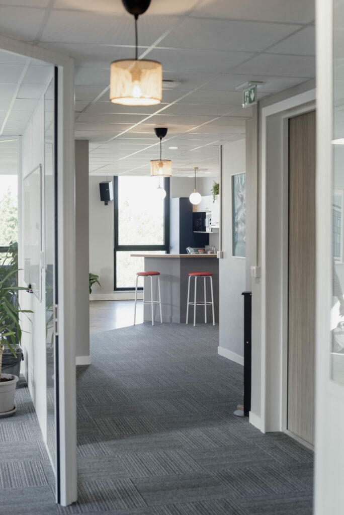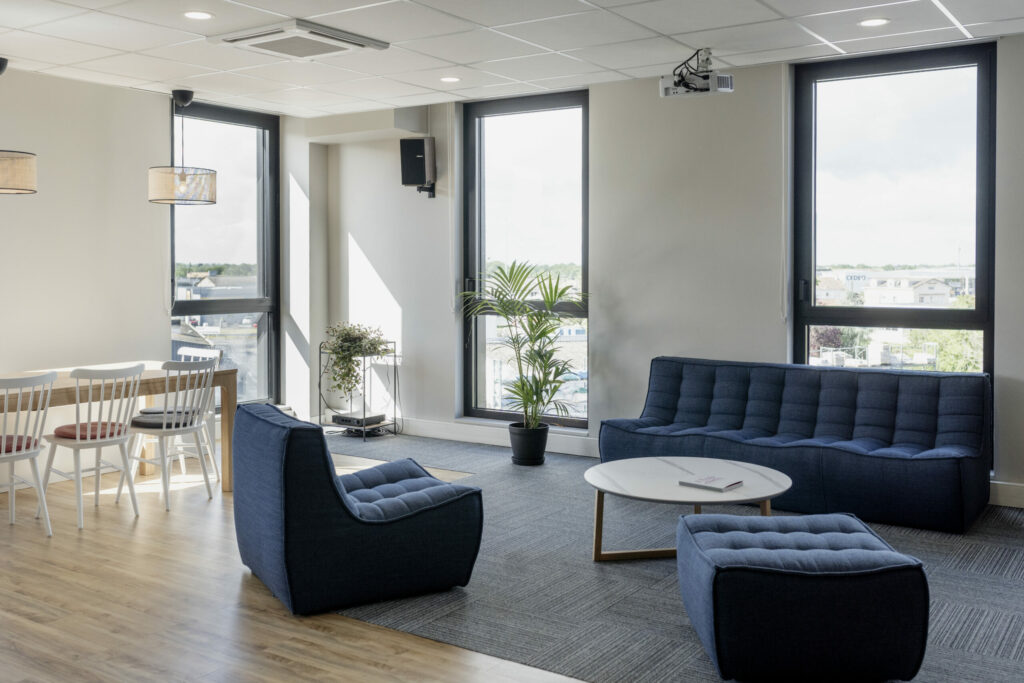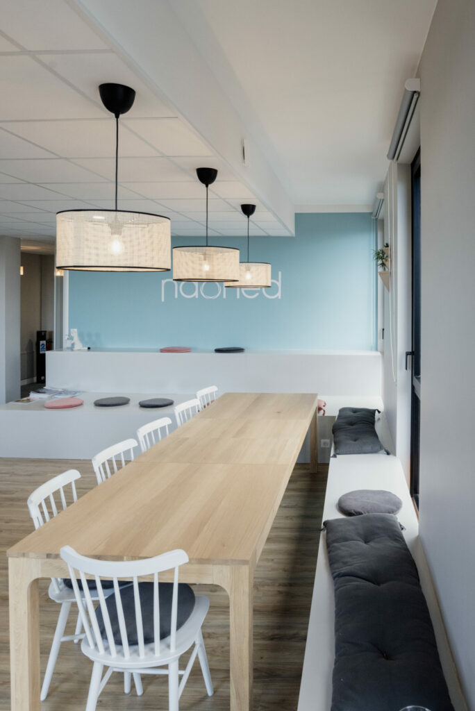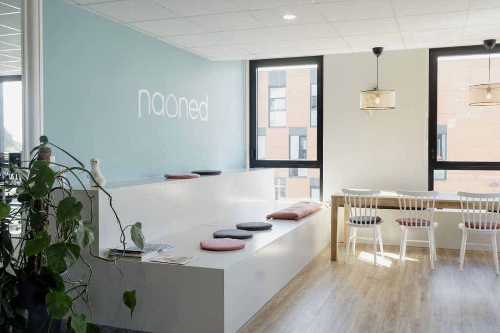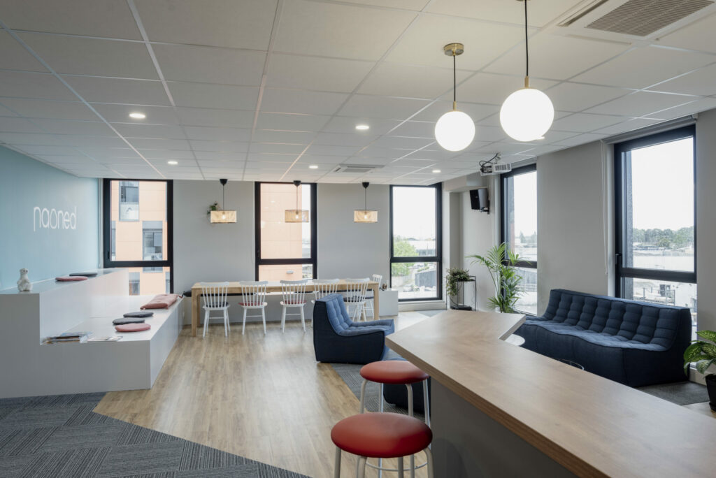 Agencement des espaces réalisé à la suite d’une étude ergonomique et organisationnelle détaillée, permettant une adéquation avec les besoins actuels et futurs de Naoned, afin d’accompagner leur développement. Création d’un forum central pour réunion plénière et travail en groupe !